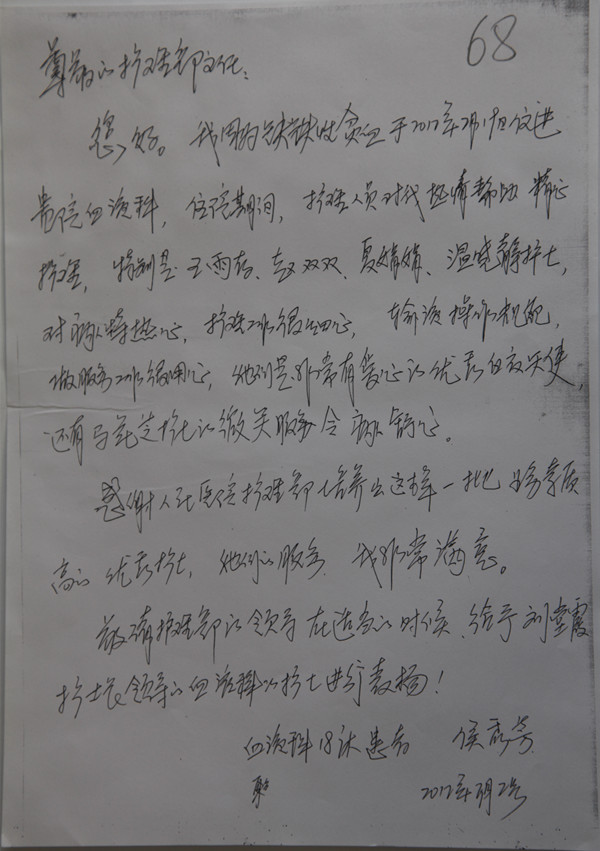 给血液科王雨存、赵双双等护理人员的感谢信
