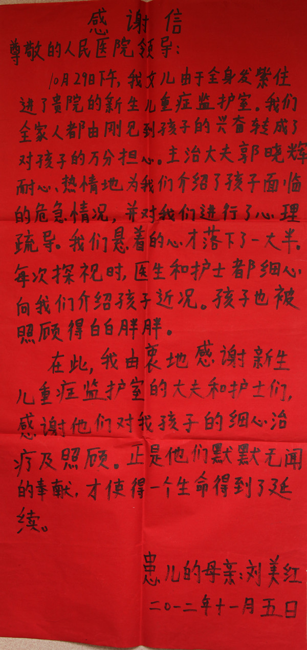 给小儿重症医学科的感谢信