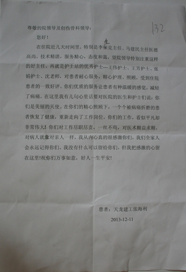 给创伤骨科李宝克、马建民、王伟等人的感谢信