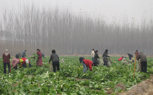 在采摘现场,记者看到爱心成员们热火朝天地在菜地里采摘、搬运。据此次活动的负责人介绍,“爱心车队”共收购白菜62袋,约2790斤,收购白菜的资金都是爱心成员们自发凑齐的,希望我们的努力能对菜农有所帮助。