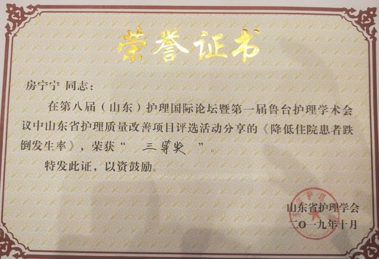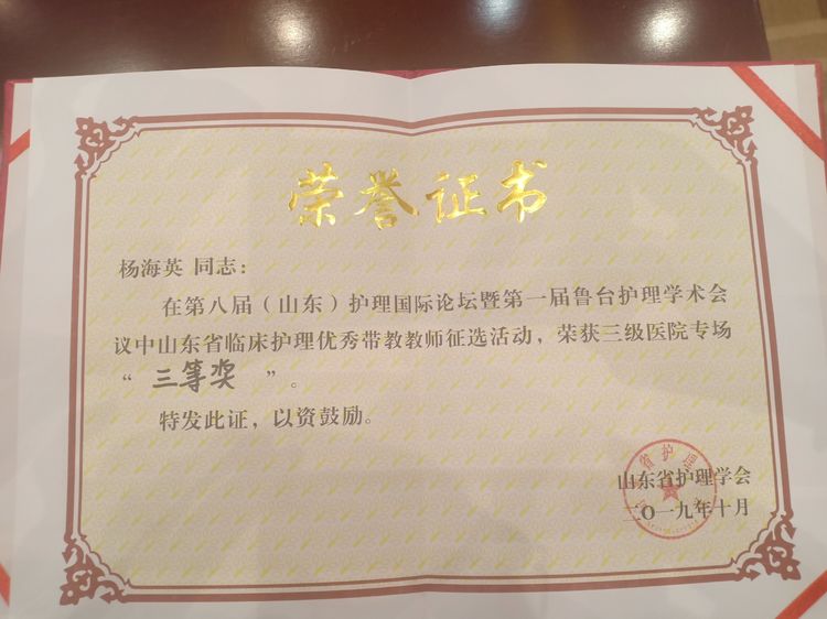2019年10月10日~12日第八届(山东)护理国际论坛暨第一届鲁台护理学术会议在淄博召开。期间,山东省护理学会主办的山东省临床护理优秀带教教师及护理质量持续改善项目评选活动如期举行,我院三项项目入围决赛并荣获二等奖、三等奖。